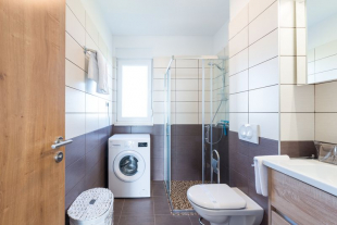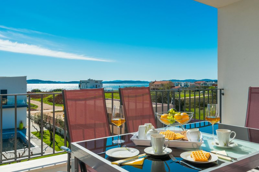 Unsere 4-Sterne Appartements (ca. 63qm groß) verfügen über 2 Schlafzimmer mit Doppelbetten, 2 Bädern mit Dusche, einem Wohn-/Essbereich und einer Küche. Schlafzimmer und Wohn-/Essbereich sind mit Klimaanlagen (Heizen und Kühlen) ausgestattet. Jedes Appartement hat einen überdachten Balkon (ca. 12qm) mit Meerblick. Der Garten verfügt über einen Pool und einer überdachten Außenküche mit Grill. Eigene Parkplätze sind auf dem Grundstück vorhanden.