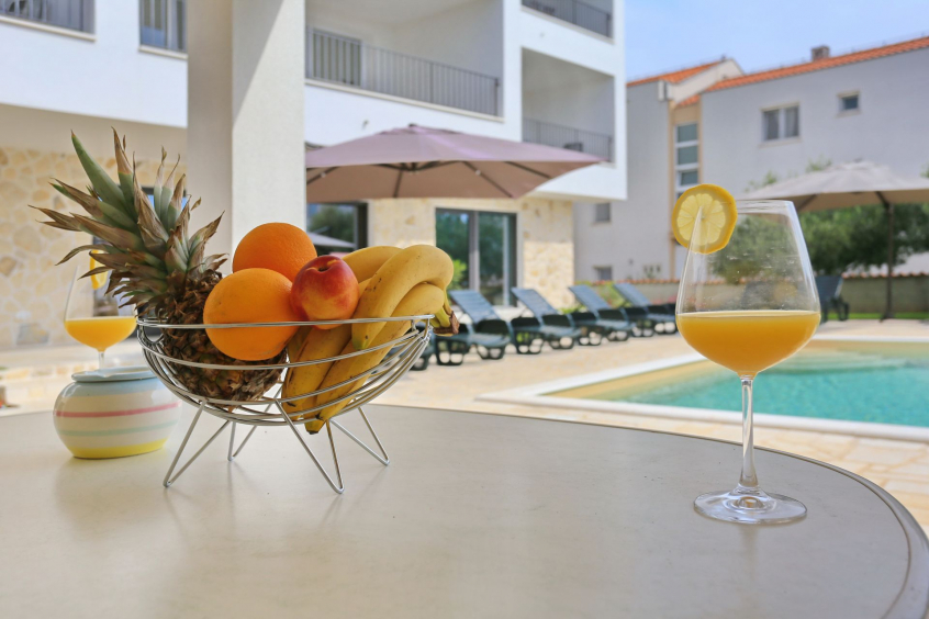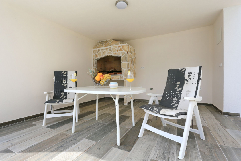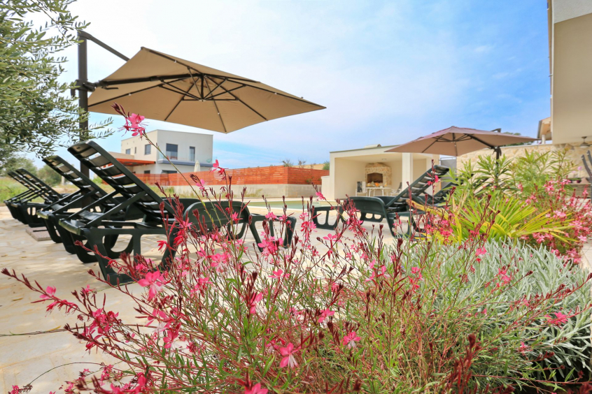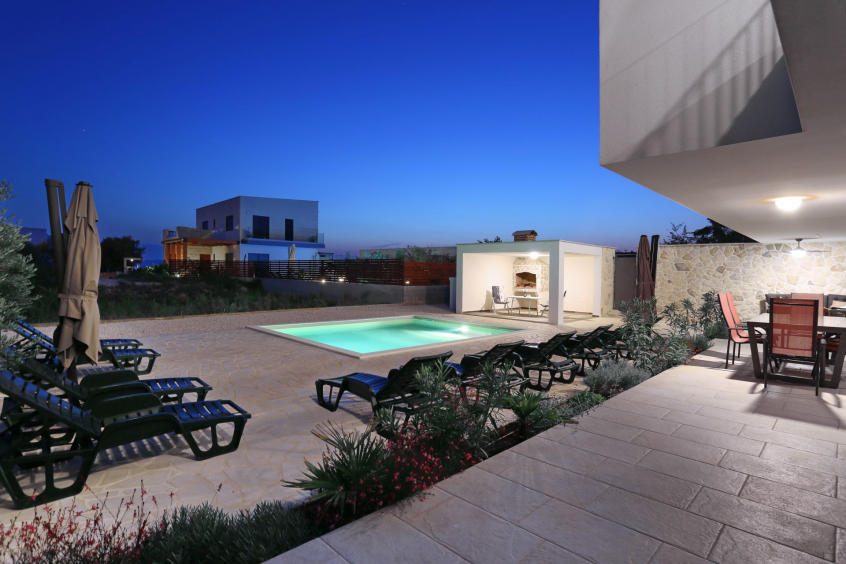 Der Pool ist 5x6m, also 30qm groß. Im Poolbereich befindet sich eine Außendusche, Sonnenliegen und Sonnenschirme. Wir haben eine „Konoba“ (überdachte Außenküche) mit Grill, Esstisch und Stühlen (Nutzung nach Absprache)